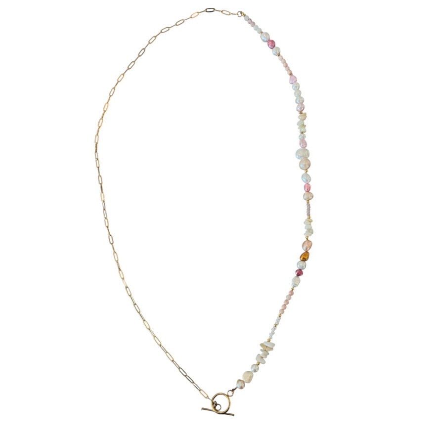 Deze ketting combineert een speelse mix van zoetwaterparels met een elegante goudkleurige schakelketting.