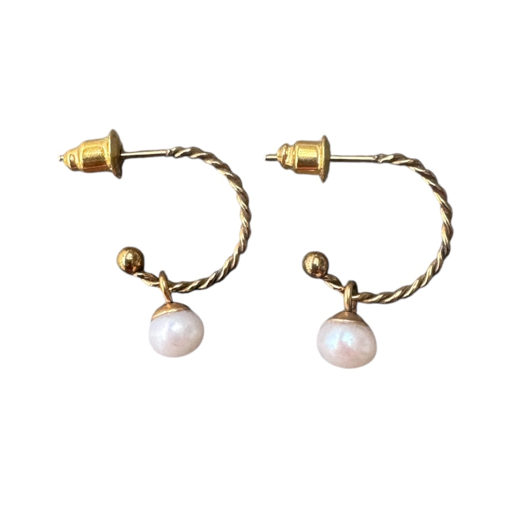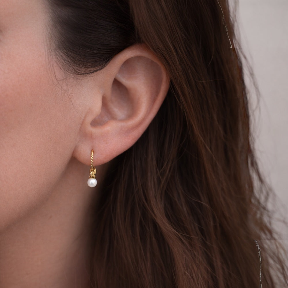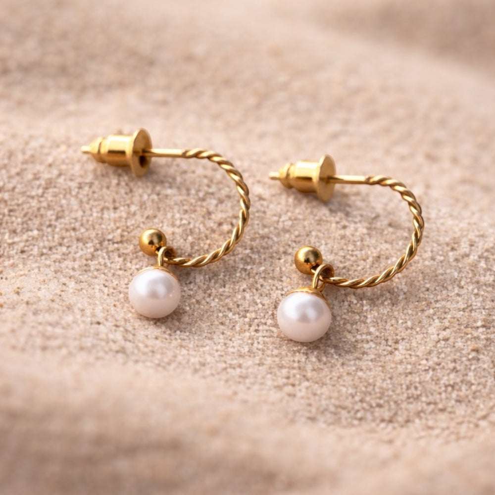 De oorbellen zijn gemaakt van roestvrij staal (RVS) en afgewerkt met een duurzame PVD-coating, waardoor de goudkleurige details langdurig hun glans behouden. De minimalistische afwerking zorgt voor een rustig en verfijnd accent dat perfect past bij het pure karakter van de parel.
